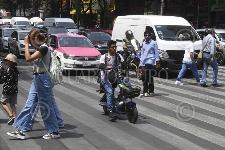 CIUDAD DE MÉXICO, 24MAYO2025.- Un joven en su moto eléctrica evade el semáforo rojo pese a la presencia de transeúntes. FOTO: MARIO JASSO/CUARTOSCURO.COM
