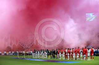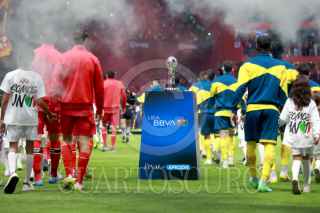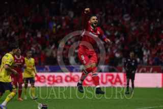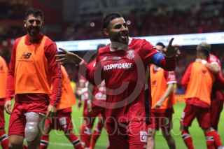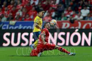 TOLUCA, ESTADO DE MÉXICO, 25MAYO2025. Andrés Pereira de los Diablos se adelanta a Alejandro Zendejas de las Águilas durante el partido de fútbol Toluca vs América correspondiente a la final de vuelta del Torneo Clausura 2025 de Liga BBVA MX, en el Estadio Nemesio Díez. FOTO: EDGAR NEGRETE LIRA/CUARTOSCURO.COM