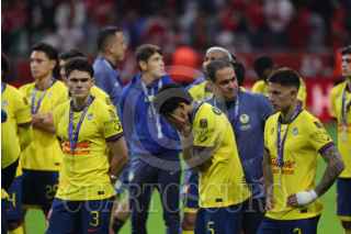 TOLUCA, ESTADO DE MÉXICO, 25MAYO2025. Jugadores del América abatidos tras perder la final ante Toluca quien se coronó campeón del Torneo Clausura 2025 de Liga BBVA MX, en el Estadio Nemesio Díez. FOTO: EDGAR NEGRETE LIRA/CUARTOSCURO.COM