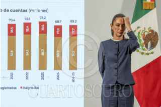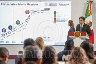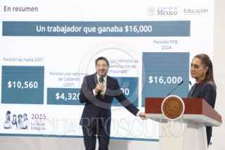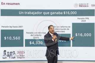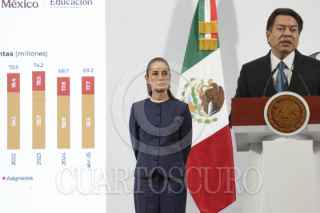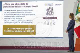 CIUDAD DE MÉXICO, 26MAYO2025.- Martí Batres, director del ISSSTE, señalo que en la época del Presidente Felipe Calderón un maestro promedio se jubilaba con un poco más de 4 mil pesos, mientras que con la Presidenta Claudia Sheinbaum, a través de acciones como la Pensión de Bienestar los profesores se jubilaran con poco más de 16 mil pesos, esto durante la mañanera en la que se tocó el tema de las semanas se la CNTE. FOTO: MOISÉS PABLO/CUARTOSCURO.COM