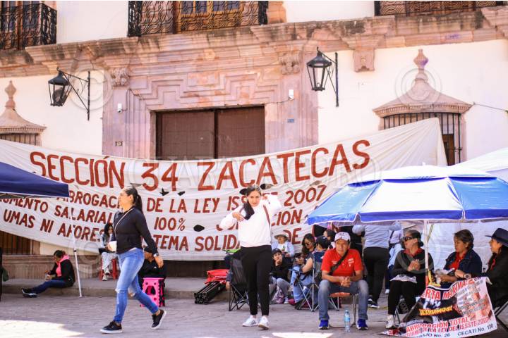 ZACATECAS, ZACATECAS, 26MAYO2025.- Maestros del Sindicato Nacional de Trabajadores de la Educación sección 34 y de la Coordinadora Nacional de Trabajadores de la Educación sección 58, realizaron un bloqueo desde muy temprano en todos los bancos del estado; como parte de las acciones de movilización nacional en demanda de la abrogación de la Ley del ISSSTE del 2007. Los docentes además mantienen un plantón permanente en la Plaza de Armas y en el Congreso del Estado, hasta llegar a acuerdos con Gobierno Federal. FOTO: ADOLFO VLADIMIR /CUARTOSCURO.COM