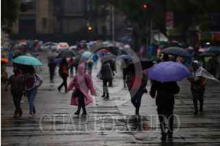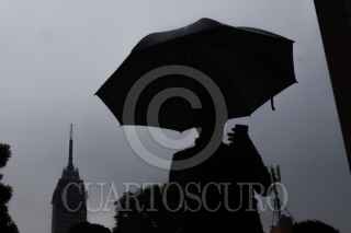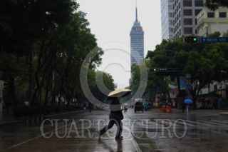 CIUDAD DE MÉXICO, 26MAYO2025.- Una persona corre sobre Avenida Juárez mientras utiliza un en paraguas para protegerse de la lluvia. FOTO: DANIEL AUGUSTO/ CUARTOSCURO.COM