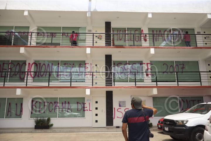 CHILPANCINGO, GUERRERO, 26MAYO2025.- Maestros de la Coordinadora Estatal de Trabajadores de la Educación en Guerrero (CETEG) irrumpieron este lunes en las oficinas del Instituto Nacional Electoral (INE) y del Instituto Electoral y de Participación Ciudadana (IEPC), como parte de una jornada de protestas contra la reforma al ISSSTE. Además de realizar destrozos, advirtieron que no permitirán la elección federal del próximo 2 de junio. Desde temprano, cientos de docentes marcharon por las principales avenidas de Chilpancingo y llegaron a la sede del IEPC, donde derribaron una reja y entraron por la fuerza. Tras exigir el desalojo del personal, realizaron pintas en paredes y ventanas. Poco después se retiraron del lugar. En declaraciones públicas, los docentes advirtieron que si sus demandas no son atendidas por el gobierno federal, encabezado por Claudia Sheinbaum, impedirán las votaciones del 2 de junio. Señalaron que las acciones de este lunes se replicaron en otros estados del país. FOTO: DASSAEV TÉLLEZ /CUARTOSCURO.COM