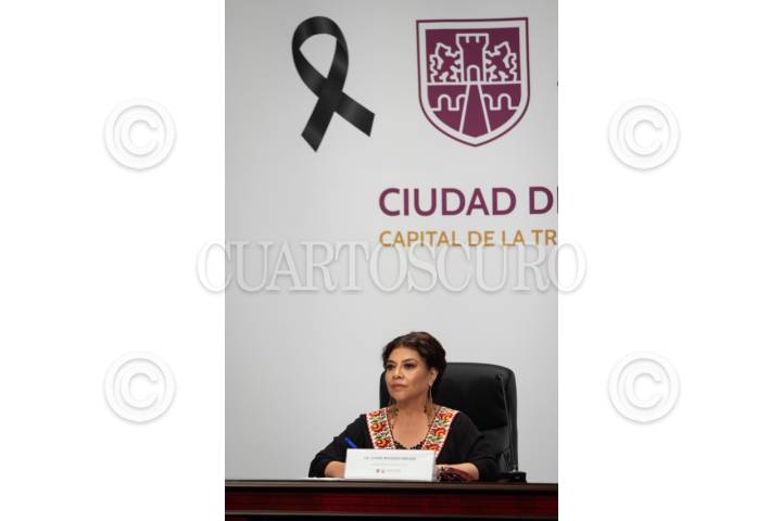 CIUDAD DE MÉXICO, 27MAYO2025.- Colocaron listón negro en el pleno que se usa para conferencias en el antiguo Palacio de Ayuntamiento en memoria de Ximena Guzmán, secretaria particular de Clara Brugada, y José Muñoz, asesor de la jefa de Gobierno, quienes fallecieron “durante una agresión”. FOTO: ANDREA MURCIA /CUARTOSCURO.COM