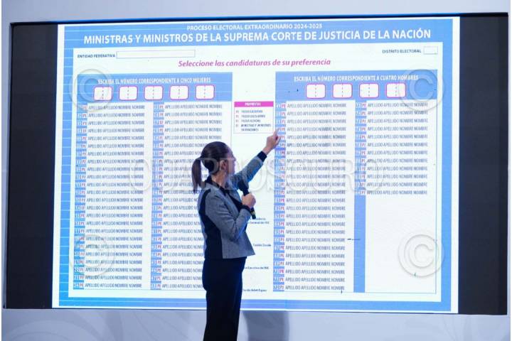 CIUDAD DE MÉXICO, 28MAYO2025.- Claudia Sheinbaum, presidenta constitucional de los Estados Unidos Mexicanos, explicó cómo la población podrá votar con las boletas el próximo 1 de junio a la elección del Poder Judicial durante la conferencia del pueblo realizada en Palacio Nacional. FOTO: GRACIELA LÓPEZ/CUARTOSCURO.COM