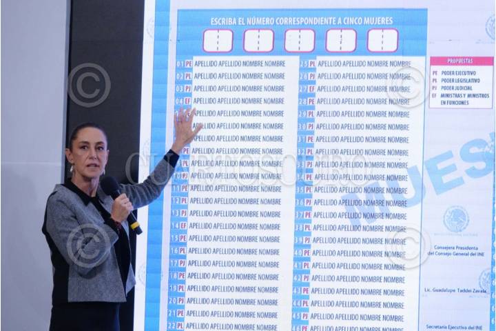 CIUDAD DE MÉXICO, 28MAYO2025.- Claudia Sheinbaum, presidenta constitucional de los Estados Unidos Mexicanos, explicó cómo la población podrá votar con las boletas el próximo 1 de junio a la elección del Poder Judicial durante la conferencia del pueblo realizada en Palacio Nacional. FOTO: GRACIELA LÓPEZ/CUARTOSCURO.COM