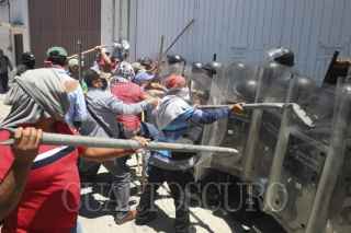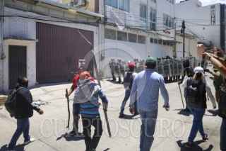CHILPANCINGO, GUERRERO, 29MAYO2025.- Integrantes de la Coordinadora Estatal de Trabajadores de la Educación en Guerrero (CETEG) se enfrentaron con elementos de la Guardia Nacional, en las inmediaciones de la Junta Distrital 07 del Instituto Nacional Electoral (INE), ubicada al sur de Chilpancingo. La movilización ocurrió en el marco de la huelga nacional convocada por la Coordinadora Nacional de Trabajadores de la Educación (CNTE), como parte de las acciones en rechazo a la ley del ISSSTE. A su llegada al módulo de atención ciudadana, donde se resguardan las boletas electorales de este domingo 1 de junio, se encontraron con que el inmueble era resguardado por elementos de la Guardia Nacional (GN), equipados con equipo antimotines. FOTO: DASSAEV TÉLLEZ ADAME/CUARTOSCURO.COM