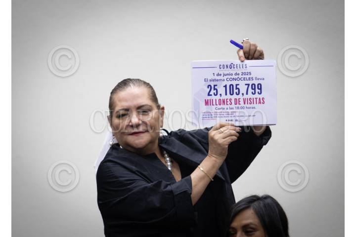 CIUDAD DE MÉXICO, 01JUNIO2025.- Guadalupe Taddei Zavala, presidenta del Instituto Nacional Electoral (INE) acompañada de consejeros durante sesión por la jornada Electoral Elecciones del Poder Judicial 2025. En la imagen muestra las vistas del sistema CONÓCELES. FOTO: ANDREA MURCIA /CUARTOSCURO.COM