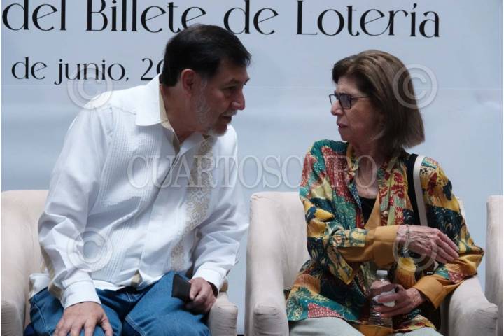 CIUDAD DE MÉXICO, 02JUNIO2025.- Gerardo Fernández Noroña, presidente de la mesa directiva en el Senado de la República, y Annie Pardo Cemo, madre de la presidenta de México, Claudia Sheinbaum, conversaron durante la develación del Billete de la Lotería Nacional en el marco del centenario del natalicio de Ifigenia Martínez. El acto se realizó en la Antigua Casona del Senado de la República. FOTO: GRACIELA LÓPEZ/CUARTOSCURO.COM