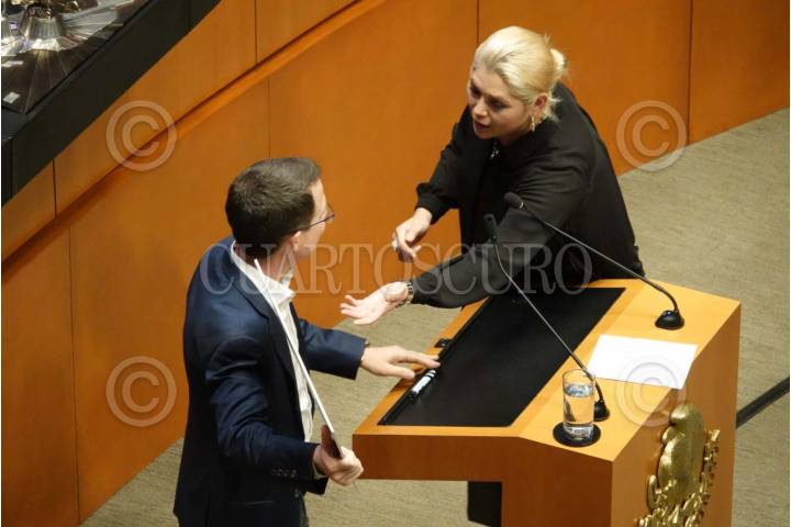 CIUDAD DE MÉXICO, 04JUNIO2025.- La senadora Verónica Camino Farjat le exigió su lámina de estadísticas al senador Ricardo Anaya durante la Sesión de la Comisión Permanente en el Senado de la República. FOTO: GRACIELA LÓPEZ/CUARTOSCURO.COM