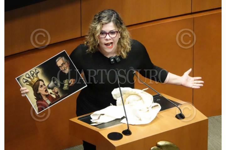 CIUDAD DE MÉXICO, 04JUNIO2025.- La senadora Lilia Aguilar Gil (PT) mostró una lámina de la senadora Lilly Téllez y el empresario Ricardo Salinas Pliego durante la Sesión de la Comisión Permanente en el Senado de la República. FOTO: GRACIELA LÓPEZ/CUARTOSCURO.COM