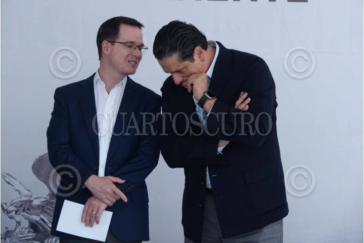 CIUDAD DE MÉXICO, 04JUNIO2025.-El senador Ricardo Anaya y el diputado Homero Niño de Rivera conversaron durante su participación en una conferencia en el Patio del Federalismo. FOTO: GRACIELA LÓPEZ/CUARTOSCURO.COM