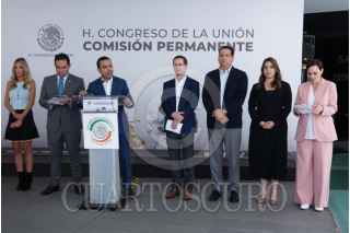 CIUDAD DE MÉXICO, 04JUNIO2025.- José Elías Lixa Abimerhi, coordinador del Partido Acción Nacional, acompañado de senadores y diputados de este partido, durante una conferencia en el Patio del Federalismo. FOTO: GRACIELA LÓPEZ/CUARTOSCURO.COM