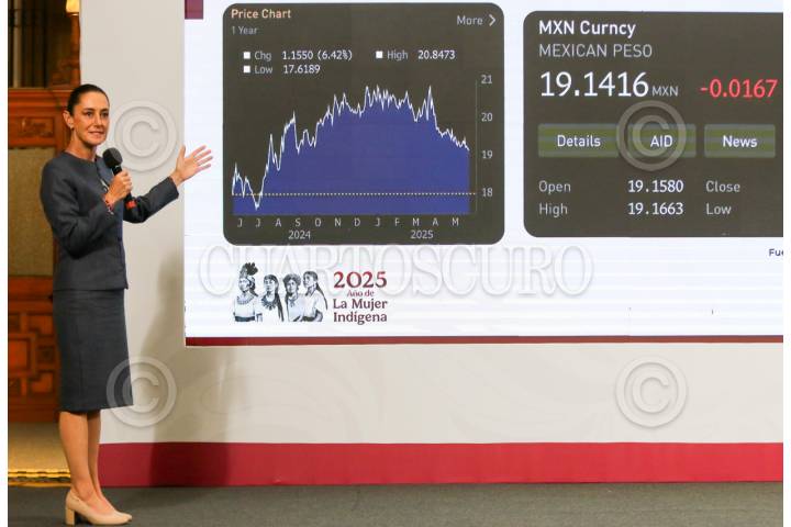 CIUDAD DE MÉXICO. 06JUNIO2025.- La Presidenta Claudia Sheinbaum Pardo, en la conferencia de prensa en el salón Tesorería del palacio Nacional, mostrando una gráfica del tipo de cambio del peso con relación al dólar. FOTO: VICTORIA VALTIERRA/CUARTOSCURO.COM