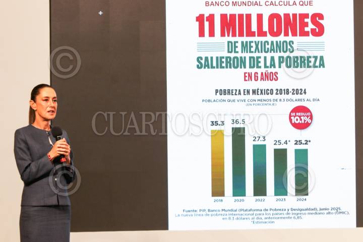 CIUDAD DE MÉXICO. 06JUNIO2025.- La Presidenta Claudia Sheinbaum Pardo, mostrando una tabla de estadística de la situación de pobreza en México. FOTO: VICTORIA VALTIERRA/CUARTOSCURO.COM