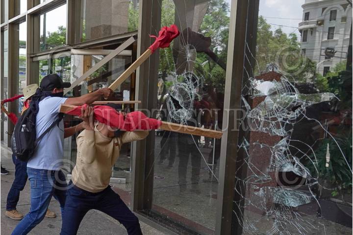 CIUDAD DE MÉXICO 05JUNIO2025.- Integrantes de la Coordinadora Nacional de Trabajadores de la Educación (CNTE) rompiendo la entrada en la Torre del Bienestar durante su protesta. FOTO:ROGELIO MORALES /CUARTOSCURO.COM
