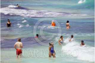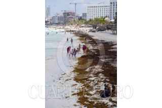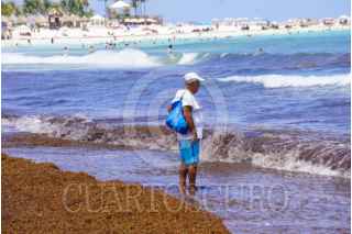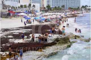 CANCÚN, QUINTANA ROO, 08JUNIO2025.- Las grandes cantidades de sargazo que recalan en las playas de Cancún no son impedimento para que cientos de personas, entre turistas y residentes, se lancen a las playas buscando refrescarse. FOTO: ELIZABETH RUIZ7CUARTOSCURO.COM