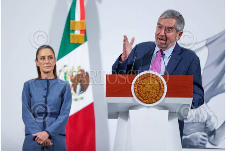 CIUDAD DE MÉXICO, 09JUNIO2025.- Juan Ramón de la Fuente, titular de la SRE, informó que casi 50 connacionales han sido detenidos durante las redadas en Los Ángeles. Ahí preciso que ya todos están recibiendo asesoría legal y mostró un número para que cualquiera que sea detenido durante estás acciones, esto durante la Mañanera del Pueblo en Palacio Nacional. FOTO: MOISÉS PABLO/CUARTOSCURO.COM