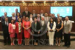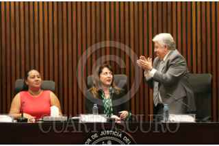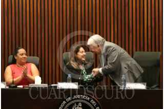 CUERNAVACA, MORELOS, 10JUNIO2025.- Margarita González Saravia, gobernadora de Morelos, reacciona ante el magistrado presidente del Tribunal Superior de Justicia, Juan Emilio Elizalde Figueroa, el cual le aplaude y se pone de pie como símbolo de admiración, atestigua la diputada Jazmín Solano, presidenta del Congreso Local. Este medio día se llevo a cabo el Encuentro Interinstitucional en la sede del Poder Judicial del Estado. FOTO: MARGARITO PÉREZ RETANA/CUARTOSCURO.COM