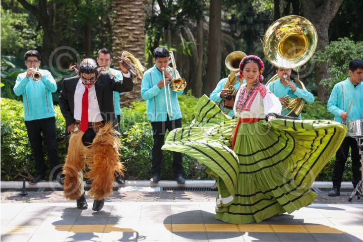 CIUDAD DE MÉXICO, 10JUNIO2025.- Danzantes bailan al compás de la música de viento durante la presentación de las actividades que se llevarán a cabo en “Julio, mes de la Guelaguetza 2025”, que se llevó a cabo en el Complejo Cultural Los Pinos. FOTO: MOISÉS PABLO/CUARTOSCURO.COM