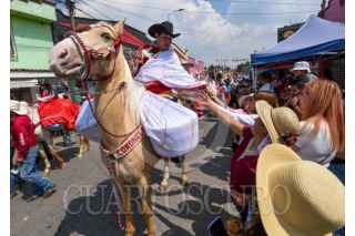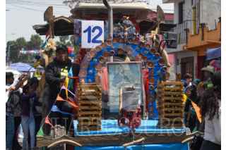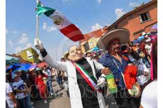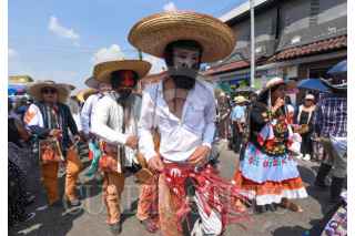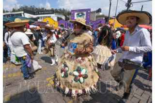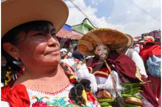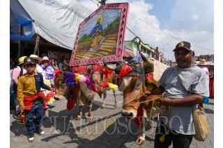 METEPEC, ESTADO DE MÉXICO, 10JUNIO2025.- Un hombre participa en el Paseo de la Agricultura en Metepec con su yunta de bueyes adornada con un retablo de semillas en honor a San Isidro Labrador Santo Patrono del municipio, con atuendos de arrieros, tlacuaneras, jinetes, monstruos, políticos, recorren al ritmo de la música las principales calles de la cabecera municipal, ofreciendo algún dulce, pan o algún otro regalo a los miles de asistentes. FOTO: CRISANTA ESPINOSA AGUILAR /CUARTOSCURO.COM
