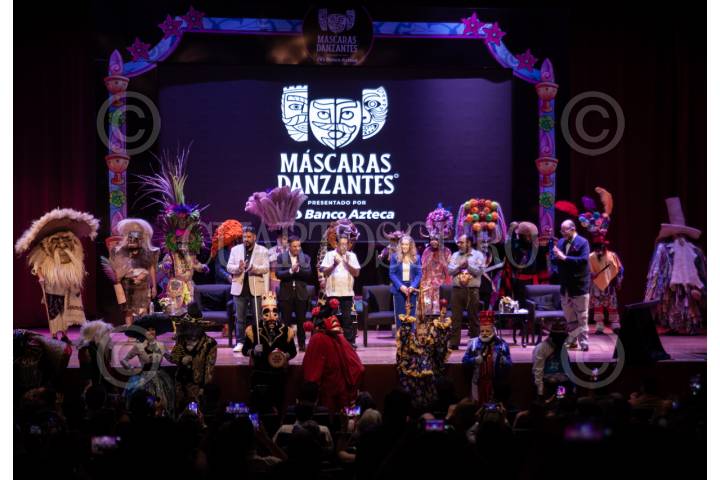 CIUDAD DE MÉXICO, 10JUNIO2025.- Ninfa Salinas Sada, Presidenta del Consejo Directivo de la Fundación Azteca acompañada de Sergio Vela, director de Arte y Cultura del Centro Ricardo Salinas Pliego; Manuel Álvarez Sánchez, fundador del proyecto Máscaras Danzantes; Alejandro Vera Guzmán representante de mascareros de México y Lubice Gómez Nijenda, representante de los danzantes de México durante presentación del proyecto Festival Nacional de Máscaras Danzantes presentado en el Museo Nacional de Antropología. FOTO: ANDREA MURCIA /CUARTOSCURO.COM