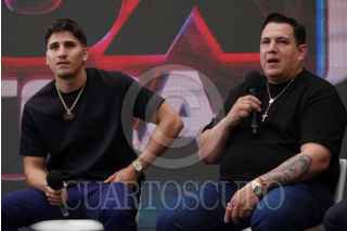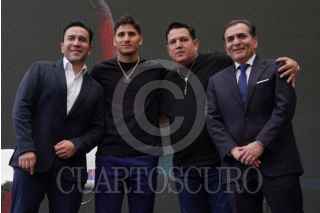 CIUDAD DE MÉXICO, 11JUNIO2025.- El narrador Césa Castro, el boxeador sinaloense Marco Verde, Eddy Reynoso, manager, y Rodolfo Vargas, director empresarial de Azteca Deportes, durante el anuncio en las instalaciones de Tv Azteca de su pelea en la que debutara oficialmente en suelo mexicano el próximo 12 de julio en Sinaloa. FOTO: GALO CAÑAS/CUARTOSCURO.COM