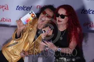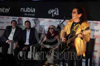 CIUDAD DE MÉXICO, 11JUNIO2025. Óscar Lara CEO de la marca Nubia, Marcos Linares Sub Director de mercadotecnia de Telcel, Chela Lora y el icónico roquero mexicano, Alex Lora durante la presentación del nuevo teléfono Nubia Music 2, con un diseño en colaboración con la banda de El Tri. FOTO: EDGAR NEGRETE LIRA/CUARTOSCURO.COM