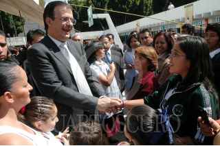 MÉXICO D.F., 06NOVIEMBRE2007 El jefe de gobierno Marcelo Ebrard saluda a niños después de hacer entrega de apoyos económicos del programa Eduación Garantizada. FOTO: RODOLFO ANGULO/CUARTOSCURO.COM