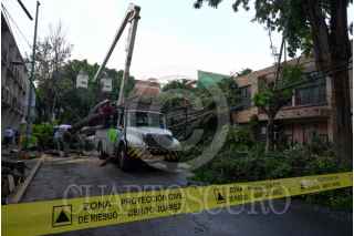 CIUDAD DE MÉXICO, 12JUNIO2025.- Un árbol de al menos 20 metros de altura cayó sobre un auto y una casa en la calle Xochicalco, casi esquina con Luz Saviñón, en la colonia Narvarte, alcaldía Benito Juárez. Bomberos, personal del Ejército y trabajadores de la CFE laboran en el retiro del árbol y el restablecimiento del servicio eléctrico. FOTO: ROGELIO MORALES /CUARTOSCURO.COM