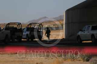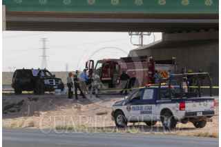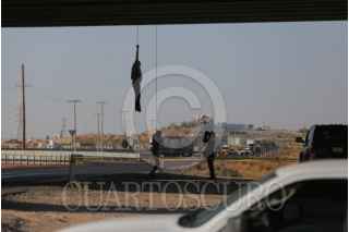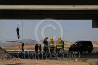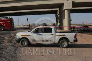 CIUDAD JUÁREZ, CHIHUAHUA, 13JUNIO2025.- Dos hombres fueron localizados colgados en un puente de la carretera Panamericana, a la altura del entronque con el libramiento hacia Santa Teresa y Tornillo, en Ciudad Juárez. Uno de ellos estaba desnudo y ambos presentaban huellas de violencia. En el lugar fue abandonada una camioneta Dodge Nitro con varios galones de gasolina y una cartulina con el mensaje: “Por huachicoleros, aquí están tus cristaleros”. FOTO: MANUEL SÁNCHEZ/CUARTOSCURO.COM FOTO: MANUEL SÁNCHEZ/CUARTOSCURO.COM