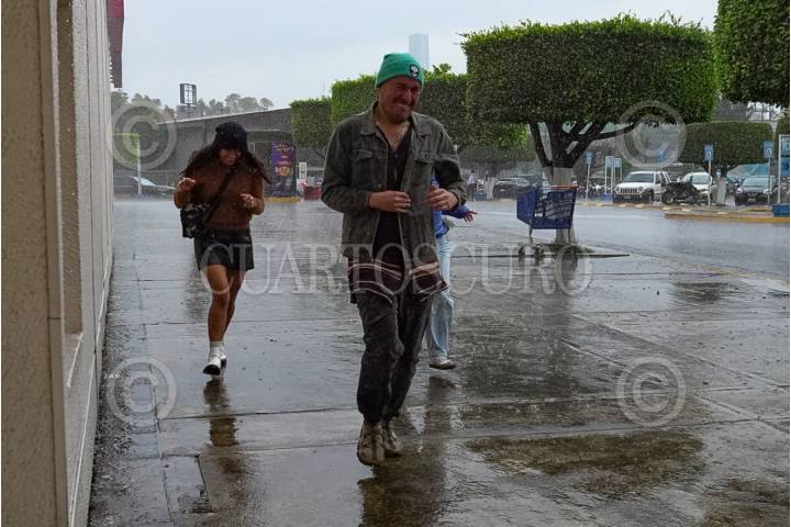 CIUDAD DE MÉXICO 13JUNIO2025.- Dos personas corren intentando cubrirse de la fuerte lluvia en la ciudad. FOTO:ROGELIO MORALES /CUARTOSCURO.COM