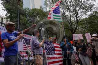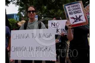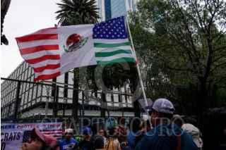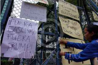 CIUDAD DE MÉXICO, 14JUNIO2025.- Ciudadanos estadounidense que habitan en la ciudad y mexicanos se dieron cita en la embajada de Estados Unidos, tras marchar del parque Luis Cabrera, para expresar su rechazo al presidente Donald Trump, quien hoy cumple 79 años, así como a su política migratoria. FOTO: GALO CAÑAS/CUARTOSCURO.COM