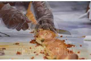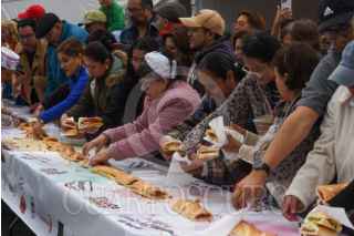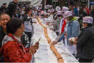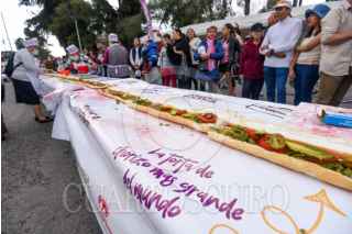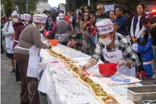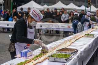 TOLUCA, ESTADO DE MÉXICO, 15JUNIO2025.- En Toluca se preparó la torta más grande de chorizo del mundo, con una longitud de 82 metros, elaborada con 100 kilos de chorizo rojo y verde, el cual fue elaborado por 10 maestras y maestros artesanos, también fueron utilizados 20 kilos de frijoles, 42 de aguacate, 46 de jitomate, 20 de chiles, 60 litros de crema y 82 metros de pan artesanal. Un notario público dio fe del tamaño de esta torta, superando el récord anterior que era de 75 metros establecido en la alcaldía Venustiano Carranza de la CDMX. En la elaboración de la torta más grande de chorizo del mundo participaron 60 personas que se dieron cita en el monumento al Centenario de la Independencia, al término de la preparación la torta fue repartida a la gente que asistió al lugar. FOTO: CRISANTA ESPINOSA AGUILAR /CUARTOSCURO.COM