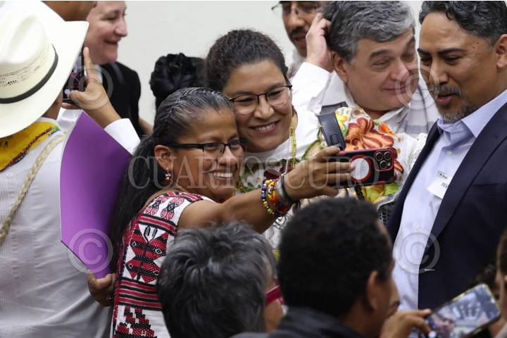 CIUDAD DE MÉXICO, 15JUNIO2025.- Lenia Batres Guadarrama se toma una foto con la diputada Irma Juan Carlos, tras tomar recibir su constancia como ministra electa en el Instituto Nacional Electoral. FOTO: MOISÉS PABLO/CUARTOSCURO.COM