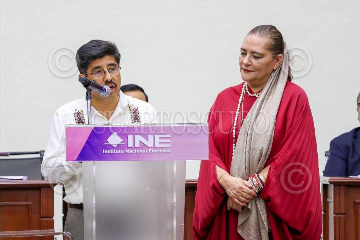 CIUDAD DE MÉXICO, 15JUNIO2025.- Hugo Aguilar Ortiz quien recibió su constancia como ministro electo de la SCJN en el INE. El futuro ministro presidente ofreció un mensaje durante la sesión. En la imagen se observa a Guadalupe Taddei Zavala, consejera presidenta. FOTO: MOISÉS PABLO/CUARTOSCURO.COM
