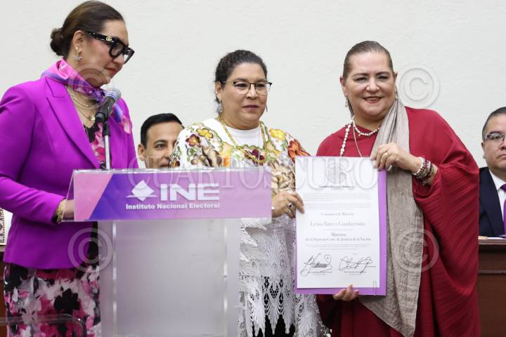 CIUDAD DE MÉXICO, 15JUNIO2025.- Lenia Batres Guadarrama recibió su constancia de ministra electa de la SCJN durante una sesión extraordinaria en el INE. La llamada ministra del pueblo fue la segunda en obtener más votos en la elección del Poder Judicial. El documento le fue entregado por la consejera electa Guadalupe Taddei Zavala. FOTO: MOISÉS PABLO/CUARTOSCURO.COM