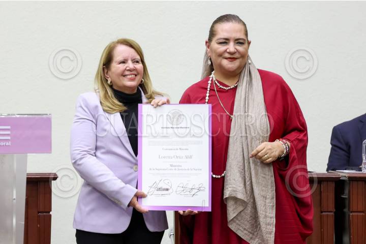 CIUDAD DE MÉXICO, 15JUNIO2025.- Loretta Ortiz Ahif recibió su constancia de ministra electa de la SCJN durante una sesión extraordinaria en el INE. La llamada ministra del pueblo fue la segunda en obtener más votos en la elección del Poder Judicial. El documento le fue entregado por la consejera electa Guadalupe Taddei Zavala. FOTO: MOISÉS PABLO/CUARTOSCURO.COM