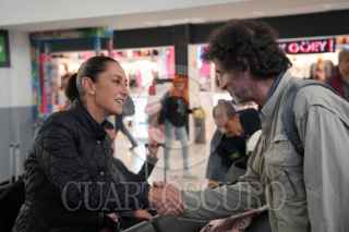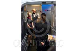 CIUDAD DE MÉXICO, 16JUNIO2025.- Claudia Sheinbaum Pardo, presidenta de México, viajó muy temprano rumbo a Canadá para participar en el encuentro de líderes mundiales del G7. La mandataria partió del AICM, donde saludó a pasajeros y a la tripulación del avión que abordó. FOTO: PRESIDENCIA/CUARTOSCURO.COM