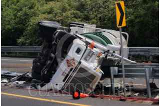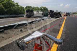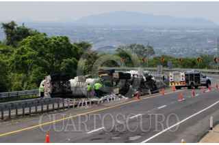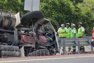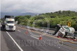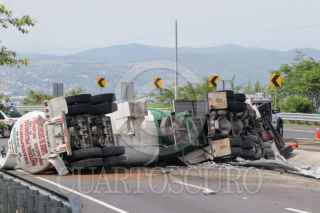 TEPOZTLÁN, MORELOS, 16JUNIO2025.-Un tractocamión volcó en el kilómetro 16 de la autopista La Pera-Cuautla. El chófer y su ayudante murieron en el percance. La circulación se mantiene cerrada en el sentido sur-norte. FOTO: MARGARITO PÉREZ RETANA/CUARTOSCURO.COM