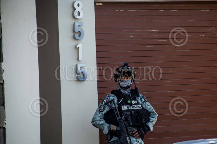 TIJUANA BAJA CALIFORNIA, 17JUNIO2025.- Un elemento de la Guardia Nacional, permanece en la entrada del domicilio ubicado en la calle Cumbres de la Encantada frente al número 8515, en la colonia Fundadores, donde autoridades federales, aseguran que fue capturado la madrugada del martes Pablo Edwin Huerta Nuño, alias "El Flakito", presunto líder del Cártel de Tijuana, en un operativo de inteligencia. FOTOS: CHRIS NOYOLA / CUARTOSCURO.COM