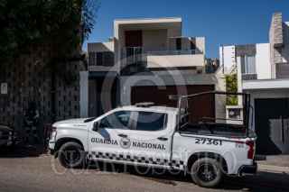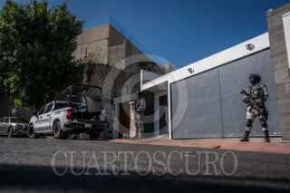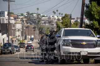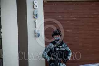 TIJUANA BAJA CALIFORNIA, 17JUNIO2025.- Dos elementos, uno la Guardia Nacional y otro del Ejercito Mexicano, permanece de pie portando armas largas en la entrada del domicilio ubicado en la calle Cumbres de la Encantada con el número 8515, en la colonia Fundadores, donde autoridades federales, aseguran que fue capturado la madrugada del martes Pablo Edwin Huerta Nuño, alias "El Flakito", presunto líder del Cártel de Tijuana, en un operativo de inteligencia. FOTOS: CHRIS NOYOLA / CUARTOSCURO.COM