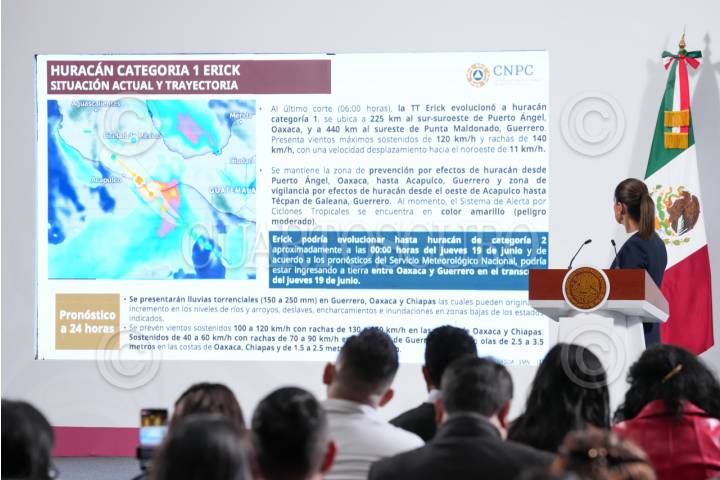 CIUDAD DE MÉXICO, 18JUNIO2025.- Claudia Sheinbaum Pardo, presidenta de México, encabezó la conferencia “Mañanera del Pueblo” en la que destacó los temas del Huracán Erick, así como su participación en el G7. FOTO: PRESIDENCIA/CUARTOSCURO.COM