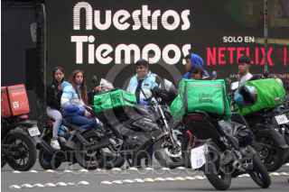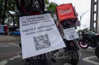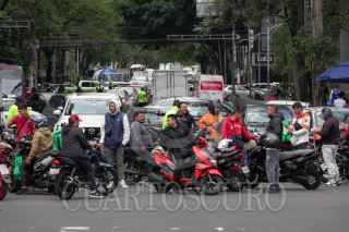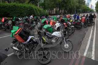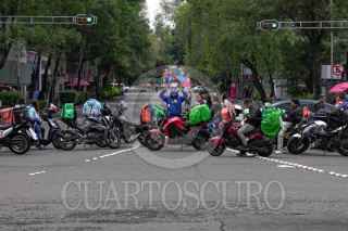 CIUDAD DE MÉXICO 18JUNIO2025.- Repartidores por aplicación, durante el bloqueo en la Glorieta de la Diana Cazadora, ante la entrada de la reforma laboral para plataformas digitales. FOTO:ROGELIO MORALES /CUARTOSCURO.COM