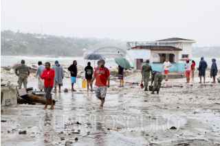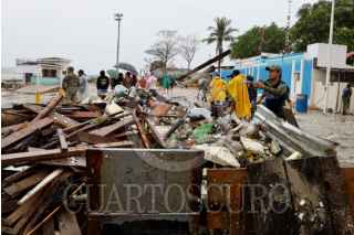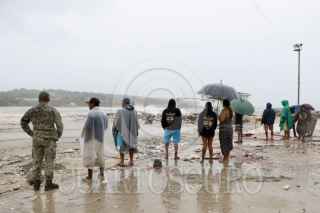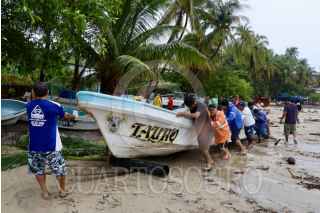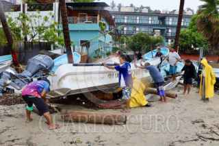 SAN PEDRO MIXTEPEC, OAXACA, 19JUNIO2025.- Lluvias constantes y oleaje elevado se registran en Puerto Escondido, luego de que el huracán Erick tocó tierra a las 5:30 de la mañana en Pinotepa Nacional, en la Costa de Oaxaca. Pescadores y prestadores de servicios turísticos a pie de playa realizan labores de limpieza y rescate de sus propiedades, los fuertes vientos y marejadas dejaron algunos daños en la Playa Principal de Puerto Escondido. FOTO: CAROLINA JIMÉNEZ MARISCAL/CUARTOSCURO.COM