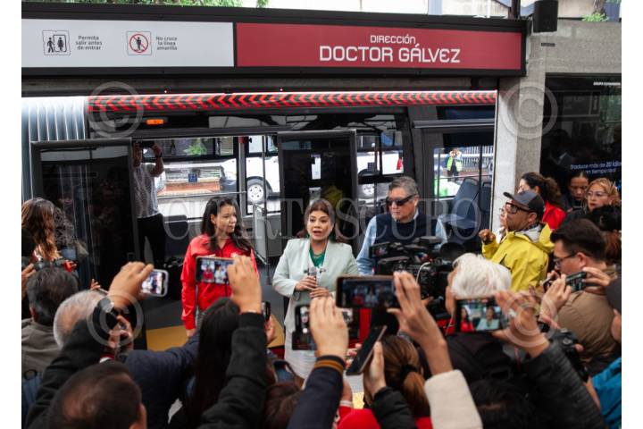CIUDAD DE MÉXICO, 06MARZO2025.- Clara Brugada, jefa de gobierno de la Ciudad, encabezó la entrega de 3 unidades eléctricas de camiones para metrobús, esta vez para la línea roja y se llevó a cabo en la glorieta de los insurgentes. FOTO: ANDREA MURCIA /CUARTOSCURO.COM