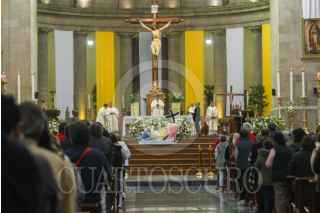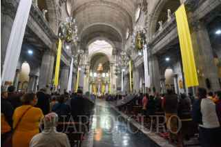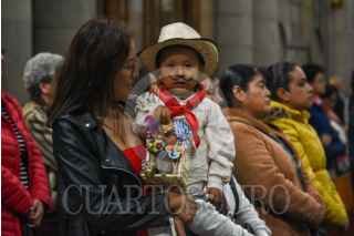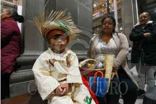 TOLUCA, ESTADO DE MÉXICO, 19JUNIO2025.- Niños ataviados con trajes de manta, huacales y sombreros de palma, acudieron con sus familias a escuchar misa a la Catedral de Toluca como parte de la celebración del Jueves de Corpus. FOTO: CRISANTA ESPINOSA AGUILAR /CUARTOSCURO.COM
