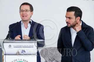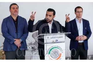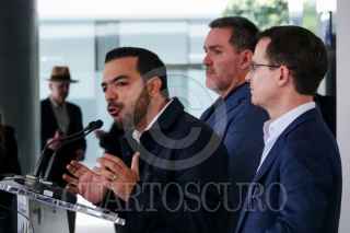 CIUDAD DE MÉXICO, 20JUNIO2025.- El diputado panista Federico Doring, Elías Lixa, coordinador panista en Diputados, y Ricardo Anaya, coordinador panista en el senado, ofrecieron una conferencia de prensa en la Cámara de Senadores en la que se posicionaron ante las declaraciones de la presidenta de México, Claudia Sheinbaum, sobre una reforma a las fiscalías. FOTO: GALO CAÑAS/CUARTOSCURO.COM