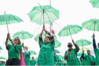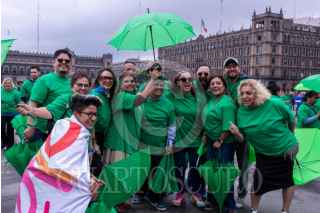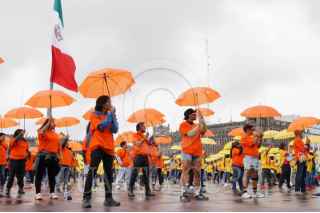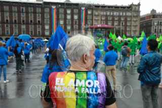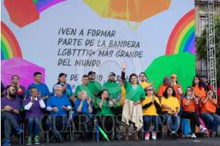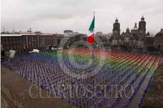 CIUDAD DE MÉXICO, 22JUNIO2025.– Clara Brugada, jefa de Gobierno, encabezó la instalación de la bandera LGBTTTIQ+ en el Zócalo, con la participación de cientos de capitalinos. La bandera fue formada con cientos de paraguas. FOTO: GOBIERNO DE LA CIUDAD DE MÉXICO/CUARTOSCURO.COM