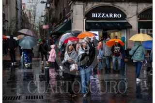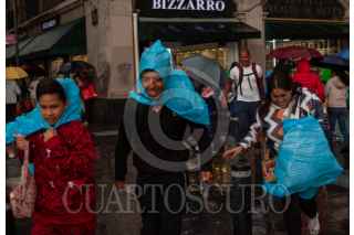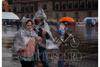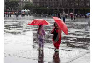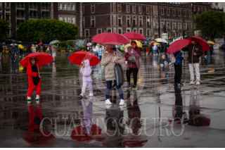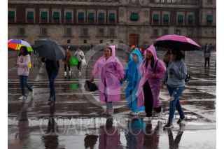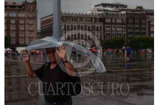 CIUDAD DE MÉXICO, 22JUNIO2025.- Visitantes del Centro Histórico se resguardan de la lluvia en la Plancha del Zócalo. FOTO: ANDREA MURCIA /CUARTOSCURO.COM